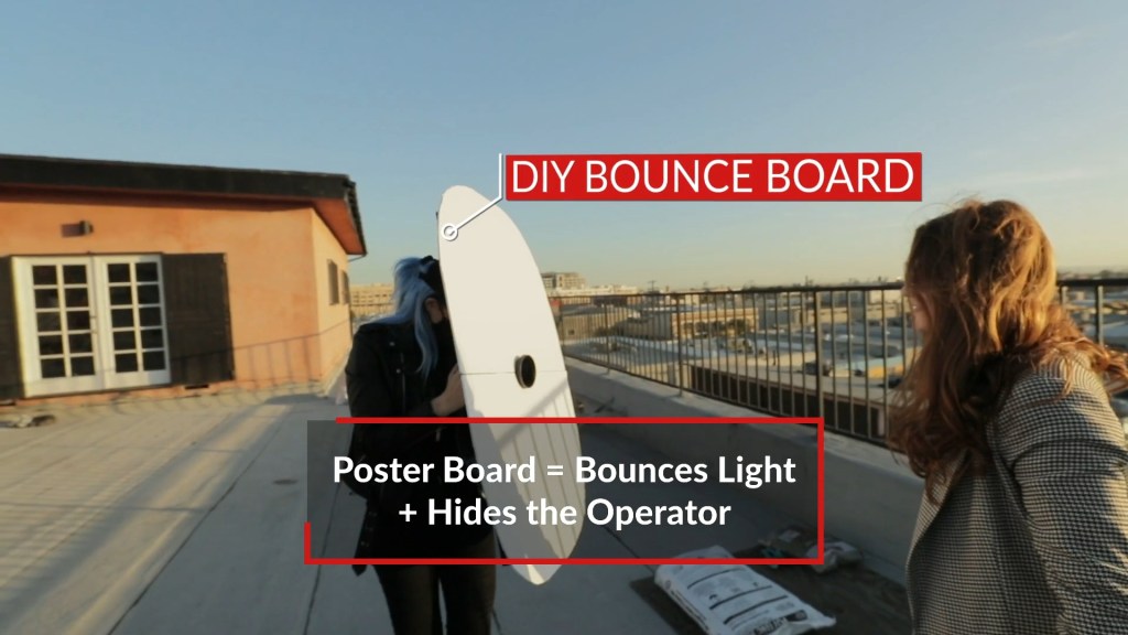 Nếu quay ngoại, ban ngày, nhân vật có mang mắt kiếng, bạn có thể dùng tấm bìa trắng lớn, khoét một lỗ vừa để ống kính lọt qua và ẩn thân dưới đó. Bạn nên bo tròn các cạnh để tạo ra hình chiếu tự nhiên trên mắt kính. Bạn có thể dùng nó như một tấm bounce để cung cấp ánh sáng cho khuôn mặt. Một công đôi chuyện.