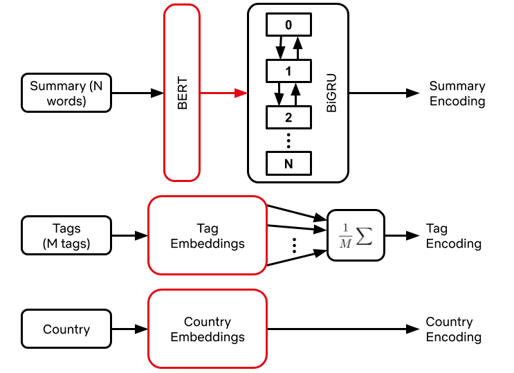 Lựa chọn bộ mã hóa (hình 4) phụ thuộc vào loại đầu vào. Đối với một tóm tắt bằng văn bản, Netflix tận dụng các mô hình được đào tạo trước như BERT để cung cấp các embedding phụ thuộc ngữ cảnh từ, sau đó được chạy qua một kiến trúc kiểu mạng thần kinh quy hồi, như một LSTM hoặc GRU hai chiều. Đối với các tag, họ học trực tiếp các biểu diễn thẻ bằng cách xem xét mỗi phim như một bộ sự tập tag, hoặc “túi-tag”. Đối với các mô hình quy mô khán gián mà trong đó các dự đoán dựa trên một quốc gia cụ thể, họ cũng học trực tiếp từ các embedding của nước đó và nối embedding kết quả với biểu diễn dựa trên thẻ hoặc tóm tắt. Về cơ bản, việc chuyển đổi mỗi thẻ và quốc gia thành embedding kết quả được thực hiện qua bảng tra cứu (lookup table).