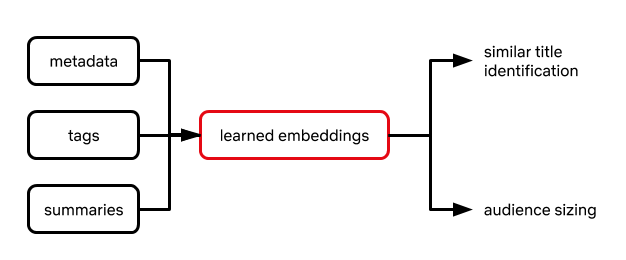 Phương pháp tiếp cận này bắt đầu từ transfer learning (các mô hình truyền đạt cho nhau khả năng mà mỗi mô hình có thể làm được), theo đó hiệu suất của mỗi tác vụ đích được cải thiện bằng cách tận dụng các tham số mô hình đã học trên một tác vụ nguồn riêng biệt nhưng có liên quan. Netflix xác định một tập hợp các tác vụ nguồn ít nhiều có liên quan đến các tác vụ đích dựa trên hai câu hỏi ở trên. Đối với mỗi tác vụ nguồn, họ tìm hiểu một mô hình dựa trên một tập hợp lớn nhiều phim đã được sản xuất, tận dụng các thông tin như metadata của phim (ví dụ: thể loại, thời lượng, nó là series hay là phim điện ảnh) cũng như các thẻ (tag) hoặc mô tả do các domain expert tuyển lựa giới thiệu chủ đề/cốt truyện của phim. Một khi đã nắm được mô hình này, các thông số mô hình được trích xuất thành biểu diễn số (numerical representation) hoặc embedding (chuyển dữ liệu chữ viết thô thành dữ liệu số thực, sau đó đưa dữ liệu số thực này vào các mô hình học) của phim. Các embedding này sau đó được dùng như đầu vào cho các mô hình hạ nguồn chuyên cho các tác vụ đích để xử lý một tập hợp phim nhỏ hơn có liên quan chặt chẽ, trực tiếp đến các quyết định nội dung (hình 1). Tất cả các mô hình đều được phát triển và triển khai bằng cách sử dụng metaflow, khung mã nguồn mở của Netflix để đưa các mô hình vào sản xuất.