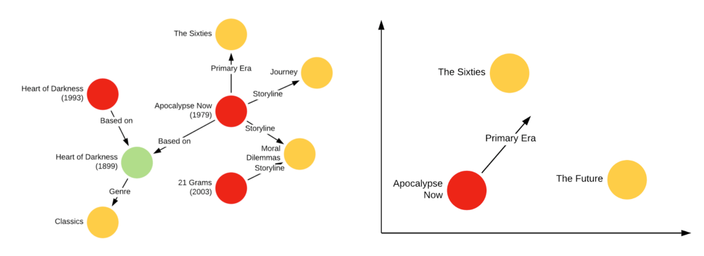 Tại Netflix, người ta áp dụng khái niệm này cho các kiến thức có trong vũ trụ nội dung. Xem xét một biểu đồ tinh giản có các node bao gồm 3 loại thực thể: {phim, sổ, metagata tag) và có các quan hệ mã hoá giữa chúng (ví dụ: “Apocalypse Now dựa trên Heart of Darkness”; “21 Grams có cốt truyện xoay quanh những tình huống khó xử về đạo đức”) như được minh hoạ trong hình 5. Các dữ kiện có thể được hiểu dưới dạng bộ ba (h,r,t), ví dụ (Apocalypse Now, dựa_trên, Heart of Darkness), (21 Grams, cốt truyện, những tình huống khó xử về đạo đức). Tiếp theo, chúng ta có thể tạo ra một tác vụ học tự giám sát trong đó chúng ta chọn ngẫu nhiên các cạnh trong biểu đồ để tạo thành một tập kiểm tra, và điều kiện trên toàn bộ phần còn lại của biểu đồ để dự đoạn các cạnh thiếu. Tác vụ này, còn được gọi là dự đoán liên kết, cho phép chúng tô học các embedding cho tất cả các thực thể trong biểu đồ. Có nhiều cách tiếp cận để phân tách các embedding và cách tiếp cận hiện tại của Netflix dựa trên thuật toán TransE. TransE học một embedding F để giảm thiểu khoảng cách Euclide trung bình giữa (F(h) + F(r)) and F(t).