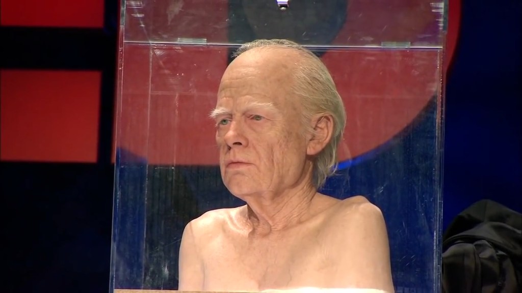 Bây giờ, điều đó thật tuyệt, trừ việc anh ấy đang ở tuổi 44. Chúng tôi cần làm anh ấy già thêm 40 tuổi nữa. Chúng tôi mời Rick Baker, và Rick là một trong những bậc thầy về trang điểm và hiệu ứng đặc biệt trong ngành chúng tôi. Và chúng tôi cũng mời một quý ông tên Kazu Tsuji, và Kazu Tsuji là một trong những nhà điêu khắc hiện thực tuyệt vời nhất trong thời đại chúng ta. Và chúng tôi ủy thác họ làm một mô hình điêu khắc, hay là một tượng bán thân của Benjamin. Theo tinh thần của “Sự tiết lộ vĩ đại” (The Great Unveiling) — Tôi phải làm điều này — Tôi phải tiết lộ điều gì đó. Đây là Ben lúc 80 tuổi. Chúng tôi tạo ra 3 cái như thế: Ben lúc 80 tuổi, Ben lúc 70 tuổi, Ben lúc 60 tuổi. Và đây thực sự trở thành khuôn mẫu để tiến xa hơn nữa.