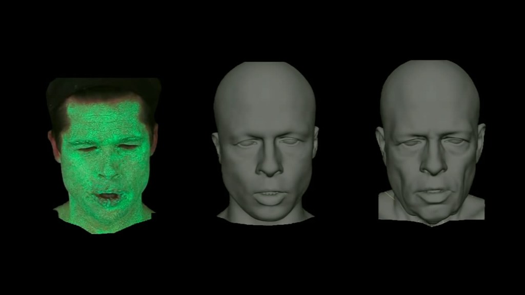 Và sau đó chúng tôi tìm thấy một vài công nghệ đáng chú ý gọi là Tạo khối. Và ở đây các bạn có thể thấy một chủ thể đang được hóa trang bằng cách chấm lân tinh lên mặt. Và bây giờ chúng ta có thể chụp toàn bộ bề mặt chứ không chỉ chụp lại một vài điểm như trong công nghệ trước. Chủ thể đứng trước một hàng các máy quay được nối với máy tính, và những máy quay đó có thể, theo từng khung hình một, mô phỏng lại hình dạng chính xác của những gì chủ thể đang làm tại thời điểm đó.