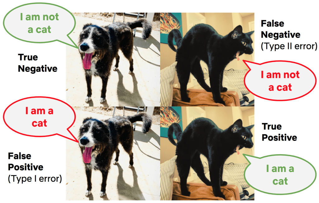 Chúng ta cũng có thể diễn giải điều này theo một cách khác: Hãy coi lý do tồn tại của internet và machine learning chính là để gắn nhãn những bức ảnh có hình mèo trong đó. Đối với một bức ảnh, có hai quyết định có thể được đưa ra (bức ảnh được gắn nhãn là “mèo” hoặc “không có mèo”), và cũng tương tự như vậy, có hai sự thật có khả năng đúng (hình ảnh thực sự có mèo hoặc không). Điều này dẫn đến tổng cộng 4 kết quả có thể xảy ra, được cho thấy trong hình 1. Điều tương tự cũng xảy ra đối với A/B test: chúng ta đưa ra một hoặc hai quyết định dựa trên dữ liệu (“Có đủ bằng chứng để kết luận rằng Top 10 list ảnh hưởng đến sự hài lòng của người dùng” hoặc “Không đủ bằng chứng để kết luận), và có hai sự thật có thể là đúng, mà chúng ta không bao giờ biết được một cách chắc chắn (“Top 10 list thực sự ảnh hưởng đến sự hài lòng của người dùng” hoặc “Nó không có ảnh hưởng”).