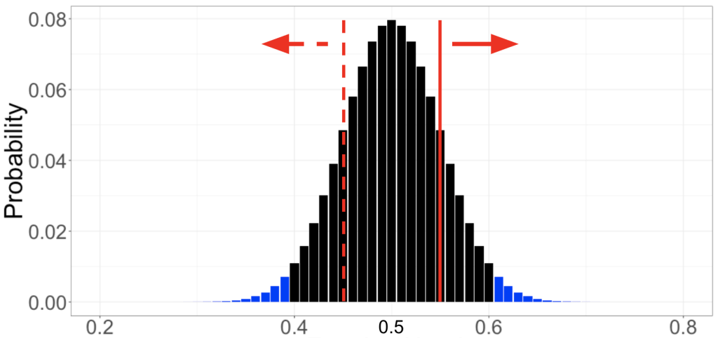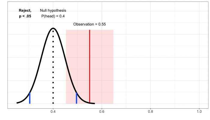Chúng ta có thể so sánh phân phối xác suất này của các kết quả, được tính toán dựa trên giả định rằng đồng xu này fair, với dữ liệu mà chúng ta có được. Giả sử chúng ta thấy 55% trong số 100 lần tung đồng xu được mặt ngửa (đường liền nét màu đỏ trong hình 3). Để định lượng xem liệu quan sát này có phải là bằng chứng thuyết phục rằng đồng xu này fair hay không, chúng ta cần tính đến các xác suất liên quan đến các kết quả ít có khả năng xảy ra hơn. Ở đây, bởi vì chúng ta chưa đưa ra giả định nào về tỉ lệ xuất hiện của mặt ngửa và mặt sấp, chúng tôi tổng hợp xác suất 55% hoặc hơn số lần tung được mặt ngửa (các thanh bên phải của đường liền nét màu đỏ) và xác suất 55% hoặc hơn số lần tung được mặt sấp (các thanh bên trái đường đứt nét màu đỏ).