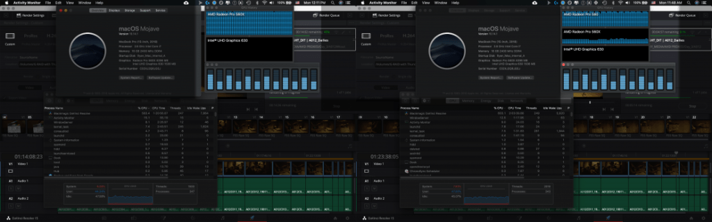 Có một quan niệm sai lầm nhỏ là eGPU làm việc song song với GPU tích hợp trong máy tính như một loại render farm, nhưng thực tế lại không phải vậy. Trong hình dưới đây, bạn có thể thấy rõ ràng là GPU thực hiện tất cả các công việc trong ảnh chụp màn hình phía bên trái và eGPU thực hiện các công việc trong ảnh chụp màn hình phía bên phải và GPU tích hợp trên máy chỉ tăng một chút công suất xử lý. Nhưng nếu chúng tôi dùng MacBook Pro 2018 13-inch thì sẽ là một câu chuyện khác vì loại 13-inch chỉ có Intel Iris Plus Graphics 640 onboard (và nó không phải là GPU chuyên dụng), vậy nên Radeon Pro 580 thực sự tạo ra một sự khác biệt lớn trong trường hợp này.