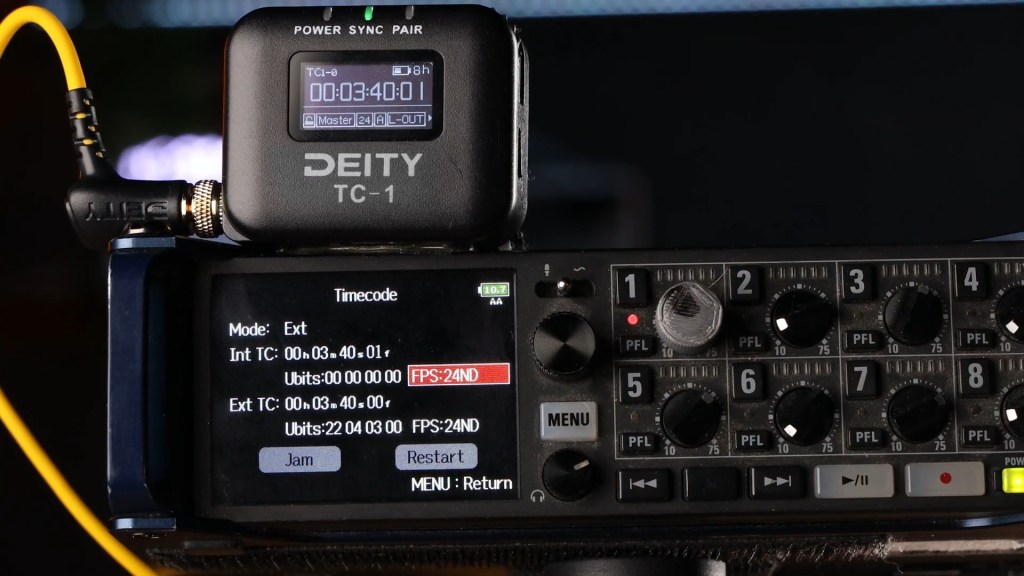 TỐC ĐỘ KHUNG HÌNH CỦA TIMECODE ÂM THANH. Các thiết bị thu âm có hỗ trợ timecode (và các thiết bị tạo timecode) thường cho phép bạn chọn tốc độ khung hình của timecode. Cái này không ảnh hưởng đến tốc độ ghi, chỉ là sự khác nhau về cách đếm timecode. Trong trường hợp đơn giản nhất, máy quay và thiết bị thu âm ghi ở cùng tốc độ khung hình – ví dụ như 23.976 fps. Mặc dù vậy, có một số trường hợp thiết bị thu âm được đặt ở tốc độ khung hình khác với máy quay. Ví dụ, thường thì máy phim sẽ quay ở tốc độ khung hình 24.00 fps. Khi phim được chuyển sang video, tốc độ khung hình có thể bị chậm lại 0.1%, vậy nên tốc độ khung hình chính xác mà bạn nên chọn để thu âm cũng nên chậm hơn.