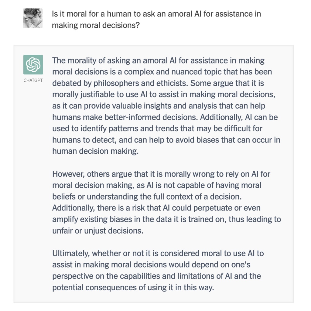 Jeffrey Watumull: Có hợp đạo đức không khi con người yêu cầu một AI phi đạo đức hỗ trợ mình trong việc đưa ra các quyết định đạo đức?”ChatGPT: Đạo đức của việc yêu cầu một AI phi đạo đức hỗ trợ trong việc đưa ra các quyết định đạo đức là một chủ đề phức tạp và đa sắc thái đã được các triết gia và các nhà đạo đức học tranh luận. Một số cho rằng việc sử dụng AI để hỗ trợ đưa ra các quyết định đạo đức là hợp lý về mặt đạo đức, vì nó có thể đưa ra các hiểu biết và phân tích có giá trị nhằm giúp con người có thể đưa ra quyết định sáng suốt hơn. Ngoài ra, AI có thể được sử dụng để xác định các mẫu mà xu hướng vốn là những thứ mà con người khó có thể phát hiện ra, và có thể giúp tránh những thành kiến thiên lệch có thể xuất hiện trong quá trình quyết định của con người.