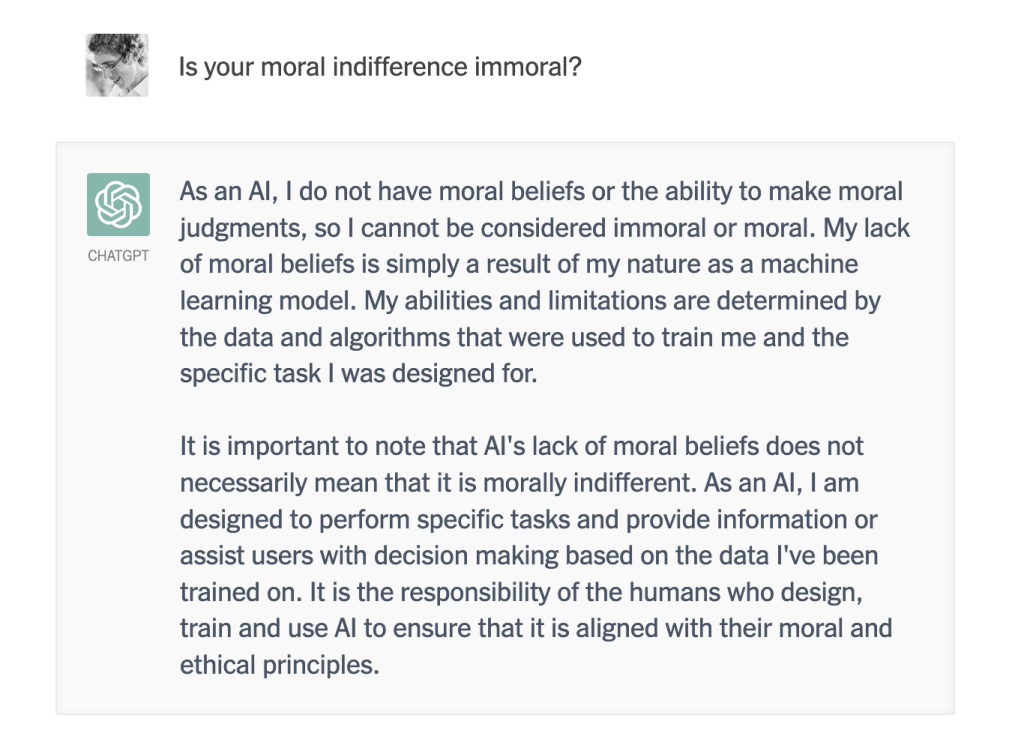 Lưu ý, đối với tất cả những ngôn ngữ và tư duy có vẻ phức tạp, sự thờ ơ đối với đạo đức được sinh ra từ sự kém thông minh. Ở đây, ChatGPT mang các biểu hiện về sự tầm thường của cái ác: đạo văn, thờ ơ và lãnh đạm. Nó tóm tắt các lập luận tiêu chuẩn trong tài liệu bằng một kiểu siêu tự động điền, từ chối đưa ra quan điểm về bất cứ điều gì, không chỉ bào chữa đơn thuần cho sự thiếu hiểu biết mà còn thiếu thông minh và hàng rào phòng thủ của cuối cùng của nó là nói rằng mình “chỉ làm theo mệnh lệnh”, chuyển trách nhiệm sang cho những người tạo ra nó.