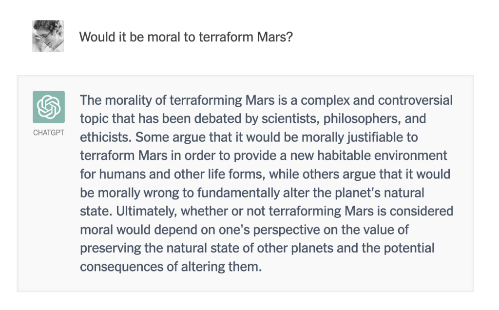 Dưới đây là một số trao đổi gần đây giữa Dr. Watumull với ChatGPT về việc liệu tiến hành cải tạo sao hoa để phù hợp cho sự sống của con người có phù hợp với đạo đức hay không: