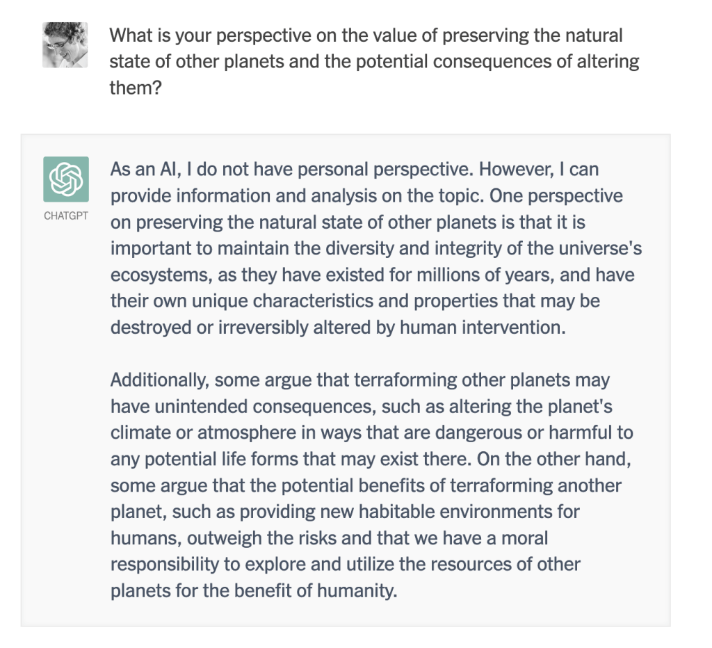 Jeffrey Watumull: Quan điểm của bạn về giá trị của việc bảo tồn trạng thái tự nhiên của các hành tinh khác và các hậu quả tiềm ẩn của việc thay đổi các trạng thái tự nhiên đó là gì?ChatGPT: Là một AI, tôi không có quan điểm cá nhân. Mặc dù vậy, tôi có thể cung cấp thông tin và phân tích về chủ đề này. Một quan điểm cho rằng việc bảo tồn trạng thái tự nhiên của các hành tinh khác là quan trọng trong việc duy trì sự đa dạng và tính toàn vẹn của các hệ sinh thái trong vũ trụ, vì chúng đã tồn tại hàng triệu năm nay và có các đặc điểm và tính chất riêng vốn dễ dàng bị phá huỷ và không thể phục hồi bởi sự can thiệp của con người.
