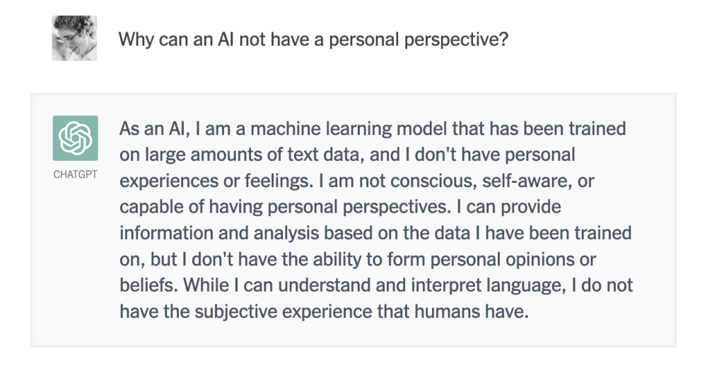 ChatGPT: Là một AI, tôi là một mô hình học máy đã được đào tạo dựa trên một lượng lớn các dữ liệu văn bản, và tôi không có trải nghiệm cá nhân hay cảm xúc. Tôi không có ý thức, không có khả năng tự nhận thức và cũng không có khả năng có quan điểm cá nhân. Tôi có thể cung cấp thông tin và phân tích dựa trên dữ liệu mà tôi đã được đào tạo, nhưng tôi không có khả năng hình thành ý kiến hoặc niềm tin cá nhân. Mặc dù tôi có thể hiểu và sử dụng ngôn ngữ, nhưng tôi không có trải nghiệm chủ quan mà con người có.