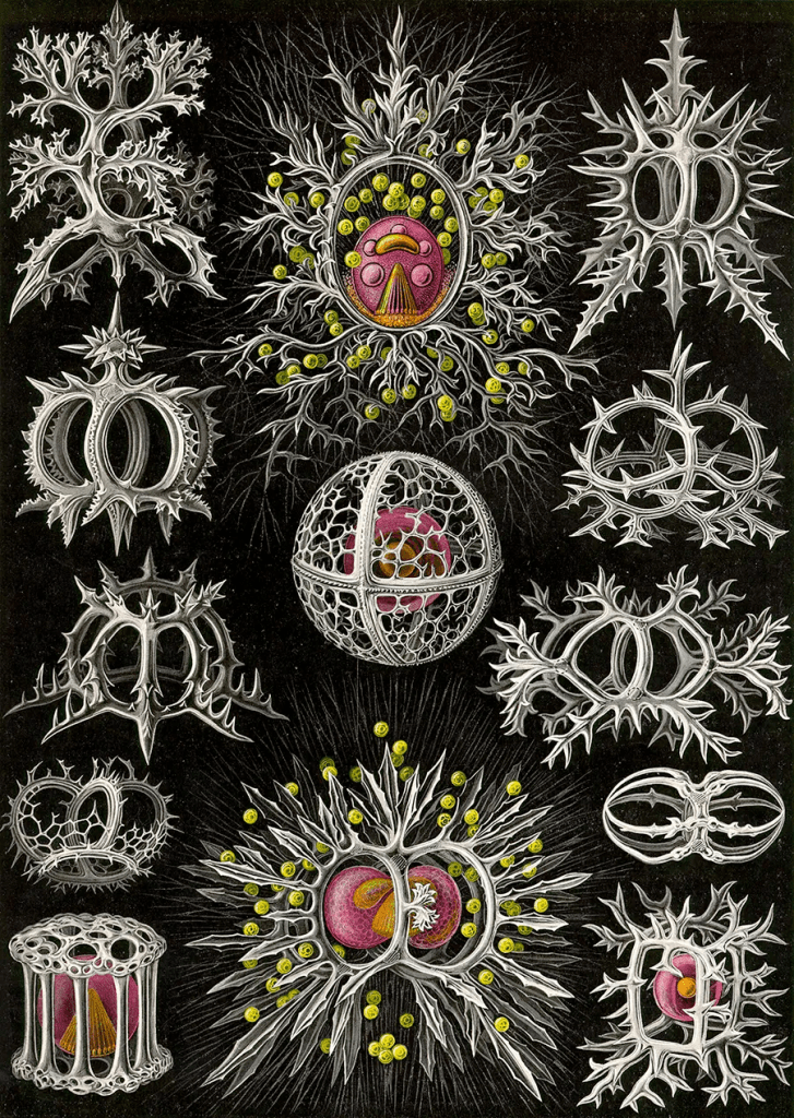 Ở tuổi ba mươi, bị thôi thúc bởi sự táo bạo kỳ lạ xuất phát từ nỗi tuyệt vọng cá nhân sâu sắc đến mức cảm thấy không còn gì để mất, Haeckel quyết định chia sẻ với Darwin – một cái tên đáng kính nhưng cũng gây nhiều tranh cãi lúc bấy giờ – về tác phẩm mà ông đã cống hiến nhiều năm: những nghiên cứu về radiolarian – các sinh vật biển đơn bào nhỏ xíu với bộ xương khoáng chất với hình dạng hình học rất ấn tượng và độc đáo – trong hai tập sách khổ lớn tuyệt đẹp. Haeckel đã minh họa chúng bằng những bức vẽ khắc đồng tinh xảo, chi tiết và đẹp đến ám ảnh.