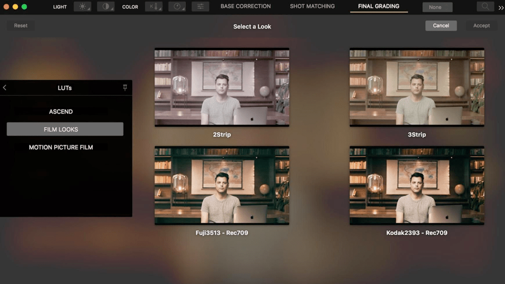 Để xem lại hình ảnh một cách chính xác, bạn sẽ cần thêm rất nhiều độ tương phản và độ bão hòa màu. Một cách phổ biến để làm việc đó là áp dụng một Look Up Table – LUT. LUT về cơ bản là một thiết lập sẵn (preset) để chỉnh màu. Bạn chọn một LUT cụ thể được thiết kế khớp với loại Log mà mình dùng để ghi, LUT này sẽ làm nhiệm vụ normalize hình ảnh để khiến nó trông giống như cảnh quay “bình thường”. Nếu bạn đã từng dùng các bộ lọc (filter) trên Instagram, thì định nghĩa về LUT cũng tương tự, nhưng LUT mang tính chính xác hơn nhiều.
